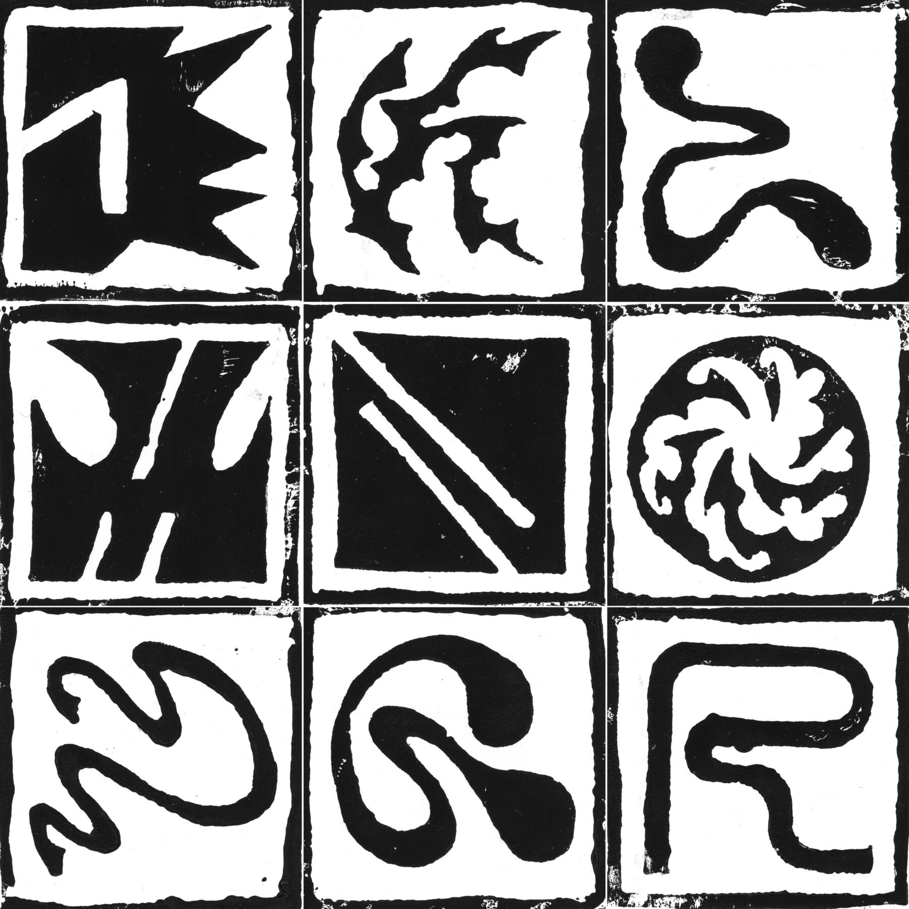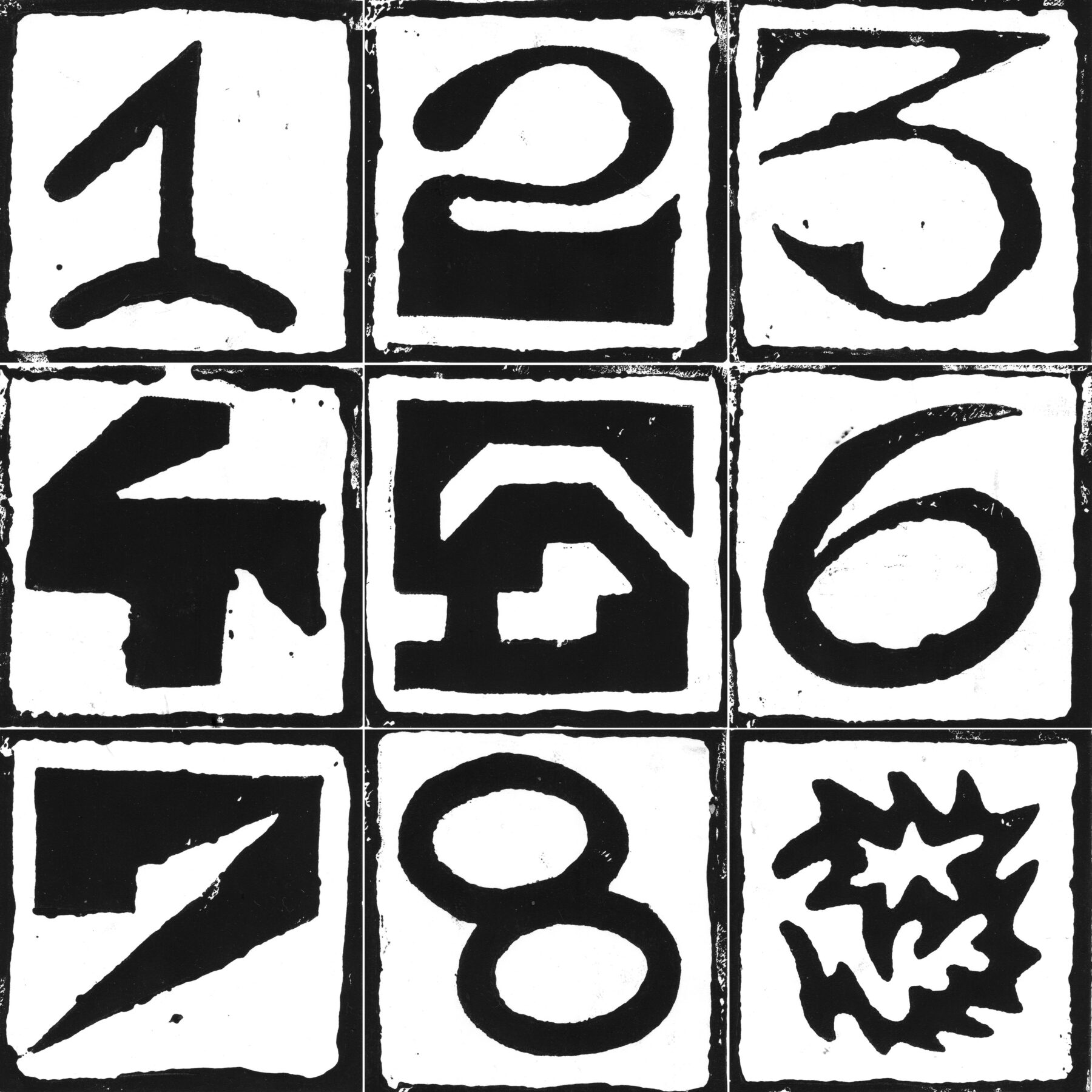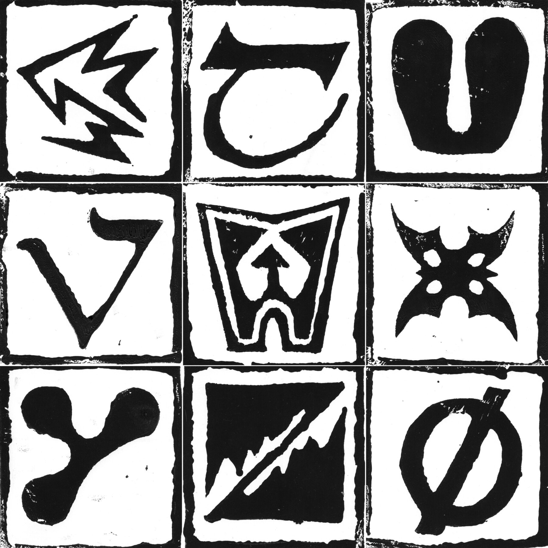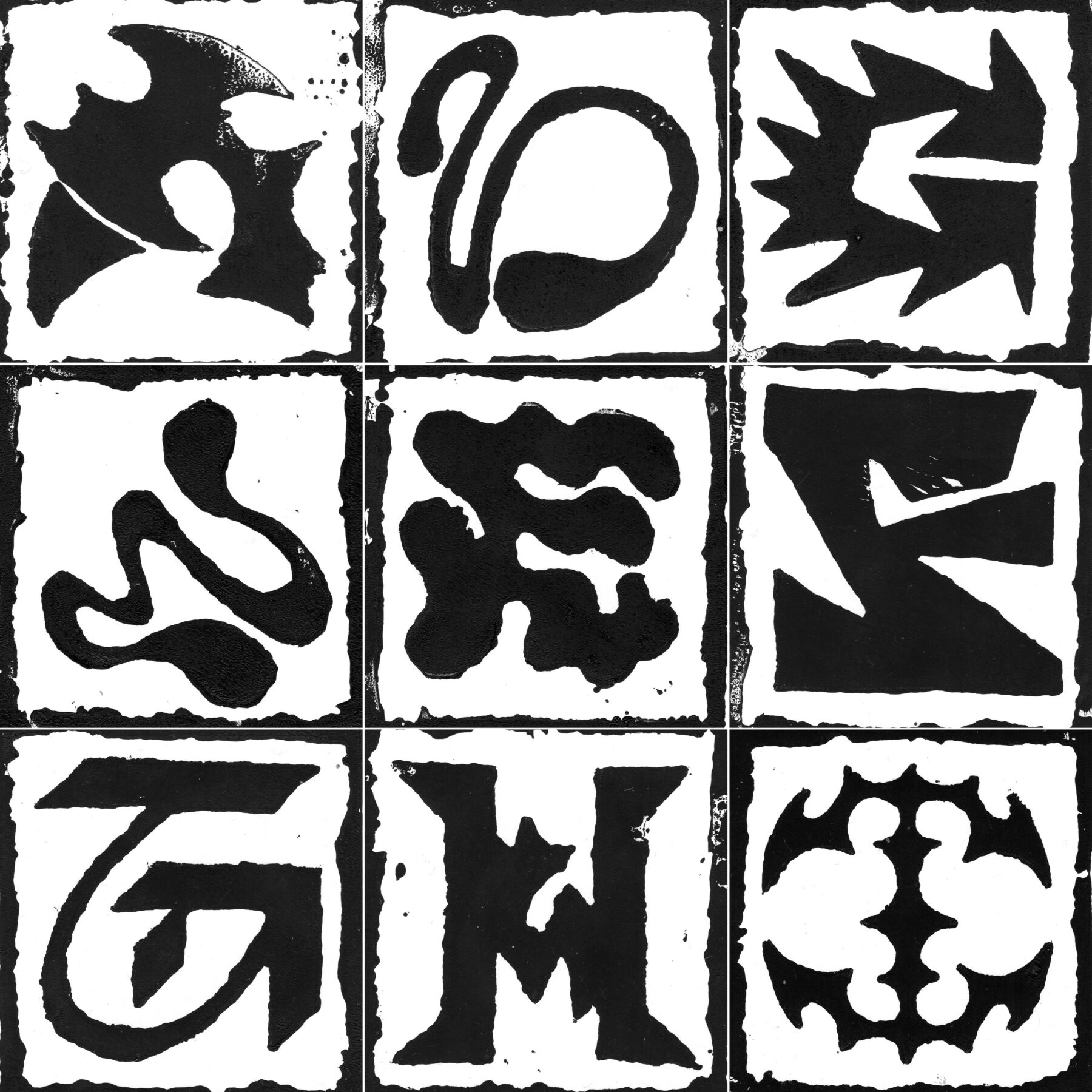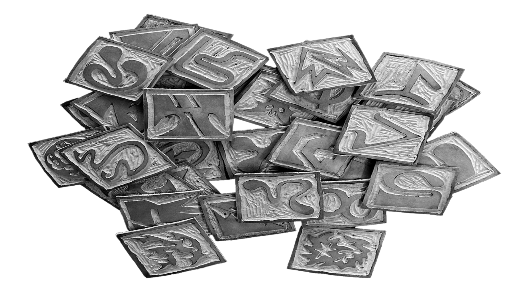 Expérimentation, linogravures de chaque lettre de l’alphabet et de chaque chiffre de 0 à 9.
